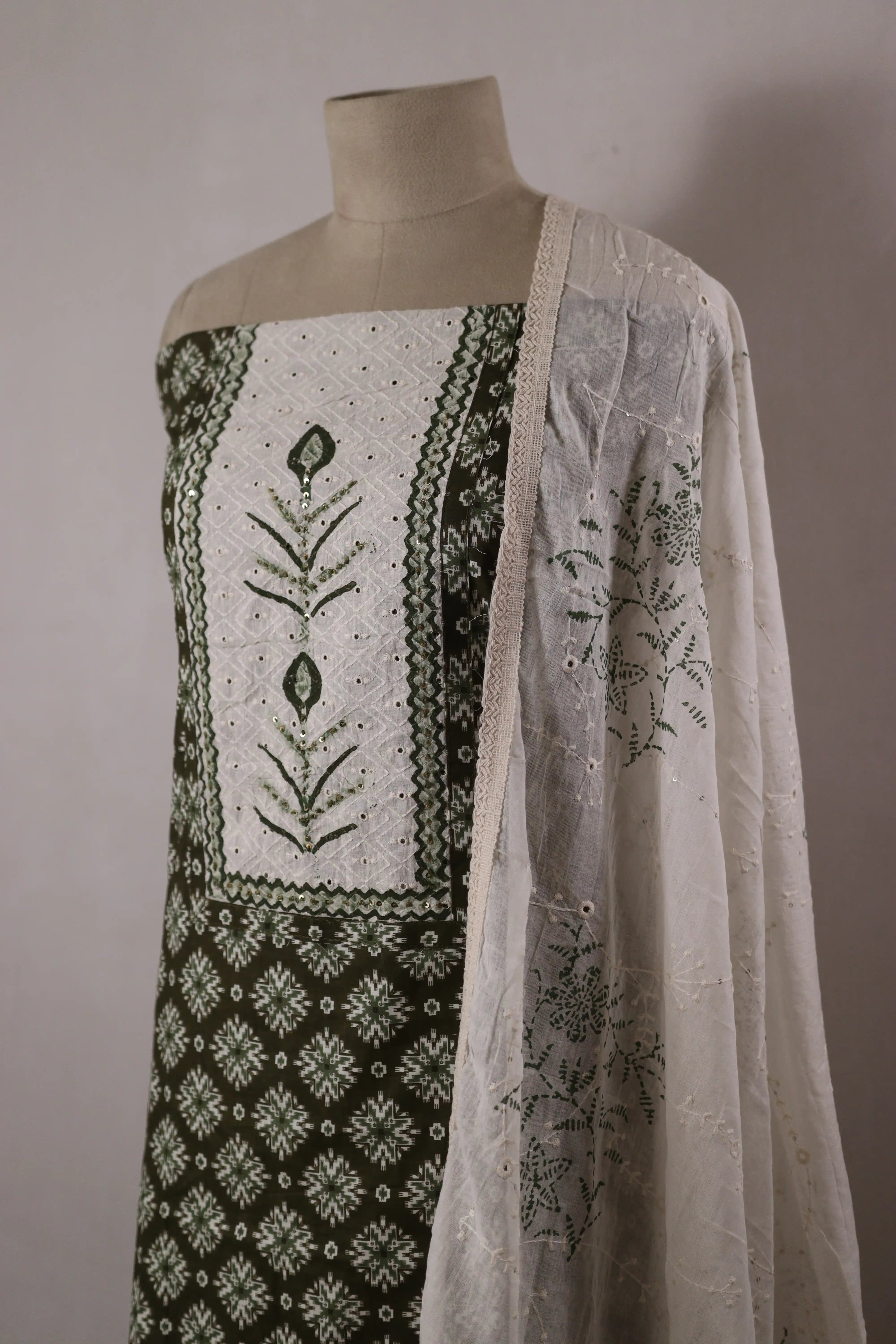 Green Geometric Printed Cotton Dress Material