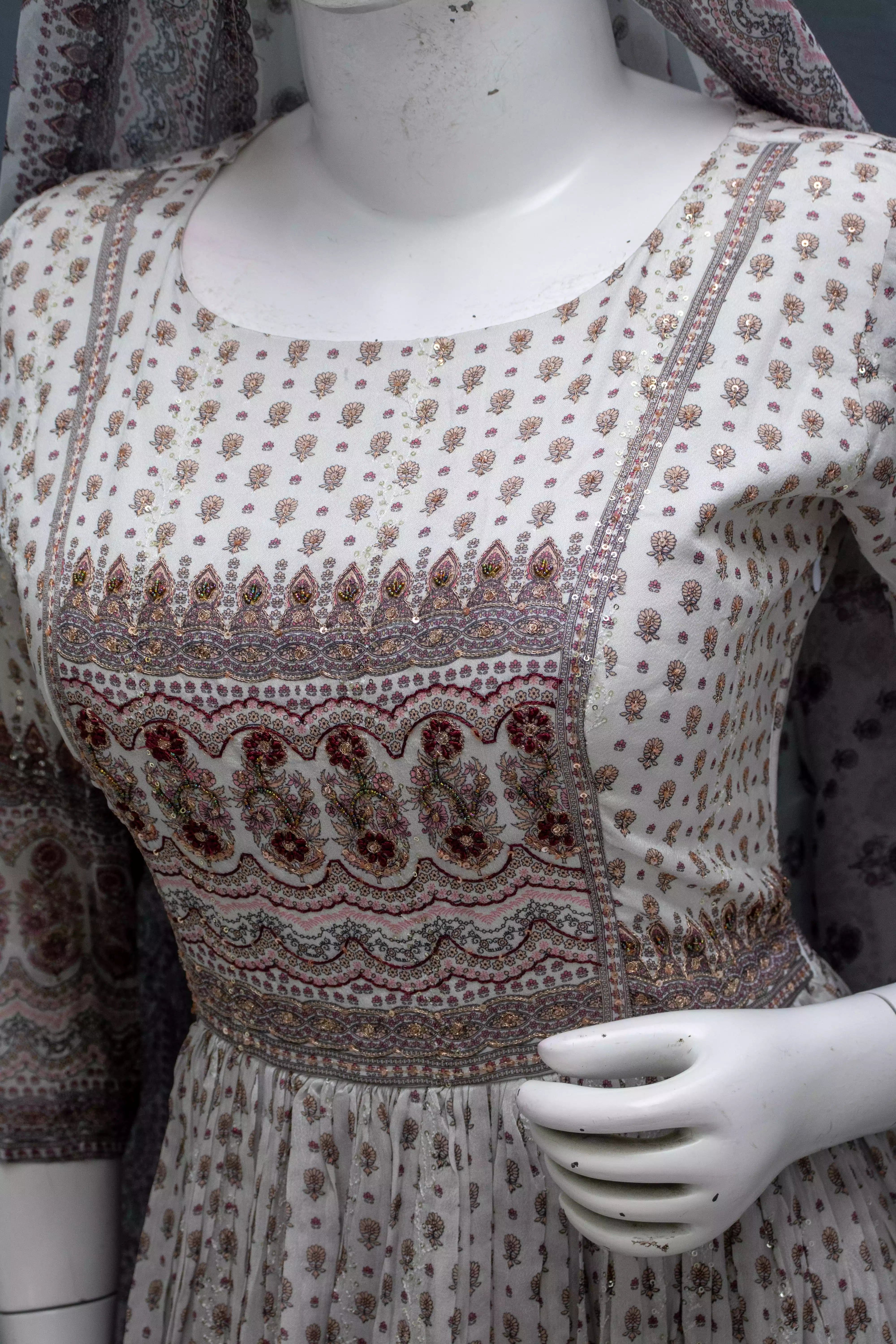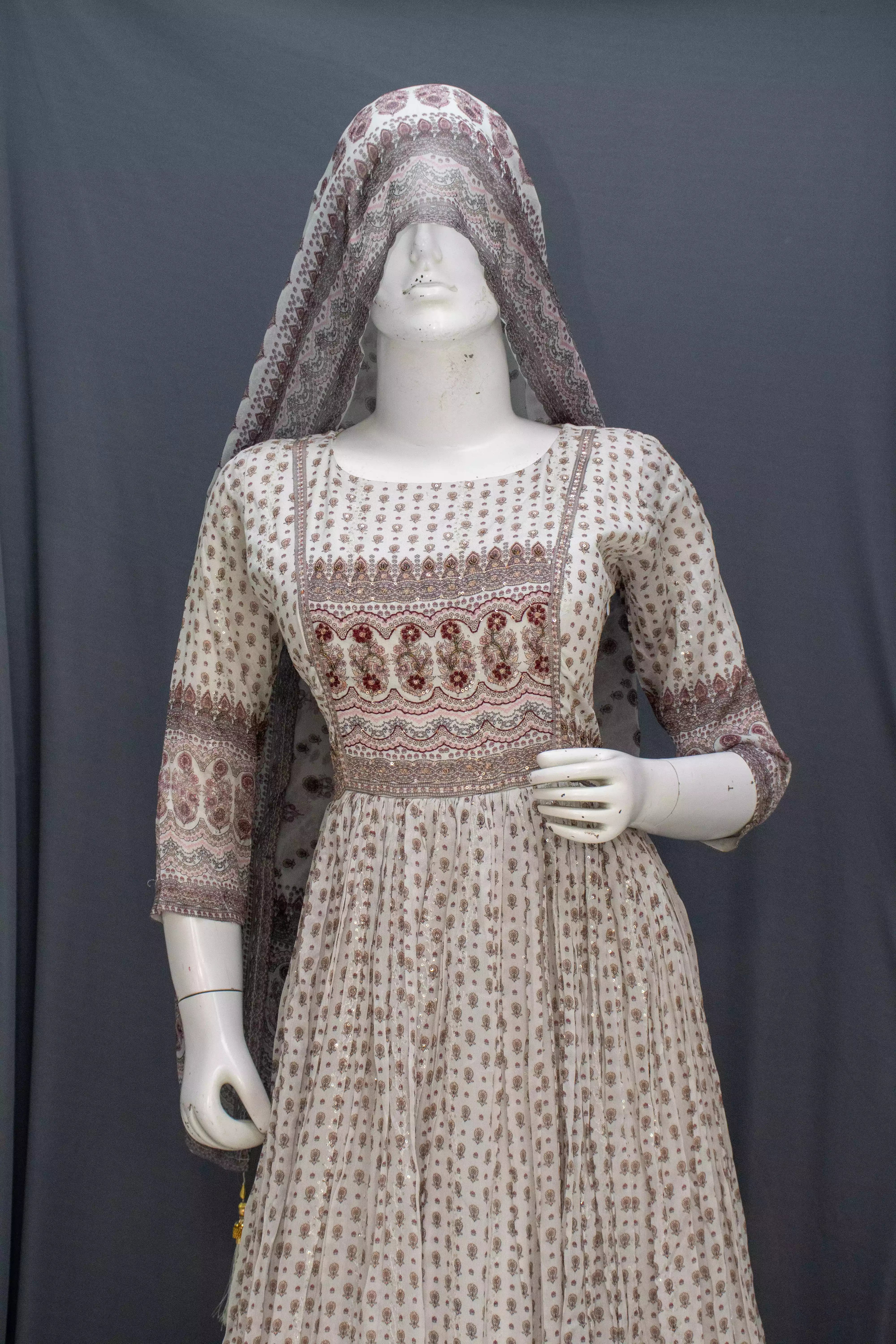 Off White Chinon Silk Gown with Machine Work